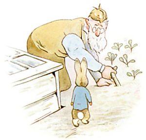 And tried to put his foot upon Peter, who jumped out of a window, upsetting three plants. The window was too small for Mr. McGregor, and he was tired of running after Peter. He went back to his work.
