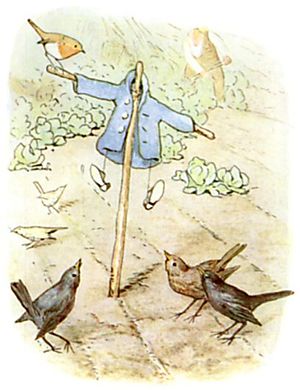 Mr. McGregor hung up the little jacket and the shoes for a scare-crow to frighten the blackbirds. Peter never stopped running or looked behind him till he got home to the big fir-tree.