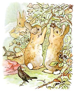 Flopsy, Mopsy, and Cotton-tail, who were good little bunnies, went down the lane to gather blackberries.